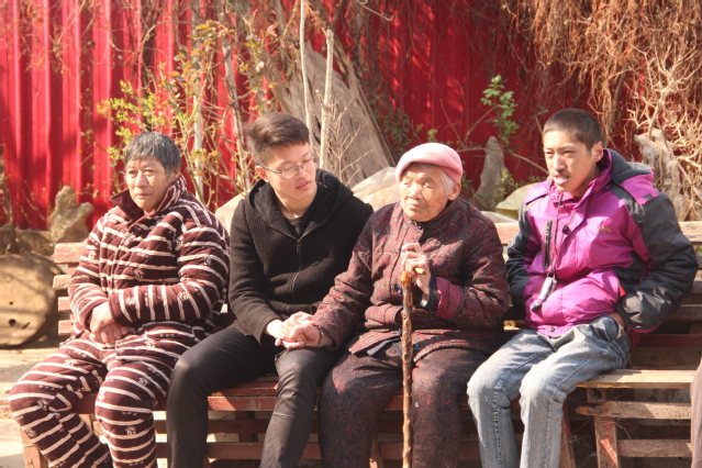志愿者们扶老人晒太阳