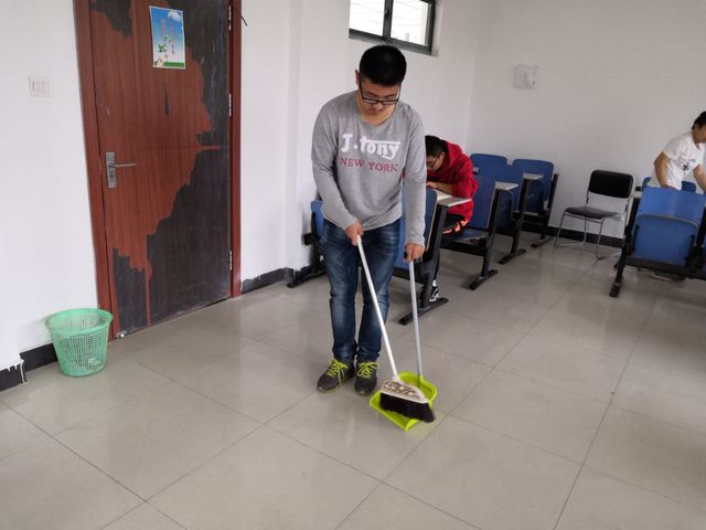 上午9点整,志愿活动正式开始。首先,志愿者们从活动负责人那里了解到具体的清洁工作并自行分为三组:一人负责扫地,将地面上的垃圾全部清理干净;一人负责擦门窗,将窗户和门上的灰和水渍去掉;最后一人则负责擦桌椅,将上面的字迹灰尘去除。考虑到可能会有同学来上自习,志愿者们在保证质量的前提下加快速度。打扫卫生时,志愿者们神情专注,将卫生死角以及难以去除的污渍清理地干干净净,脸上丝毫没有不耐烦的神情。通过这次活动,参与打扫的同学了解到了保洁阿姨工作的不容易。在打扫结束后,志愿者们表示:打扫自习室虽然很累,但却十分值得。