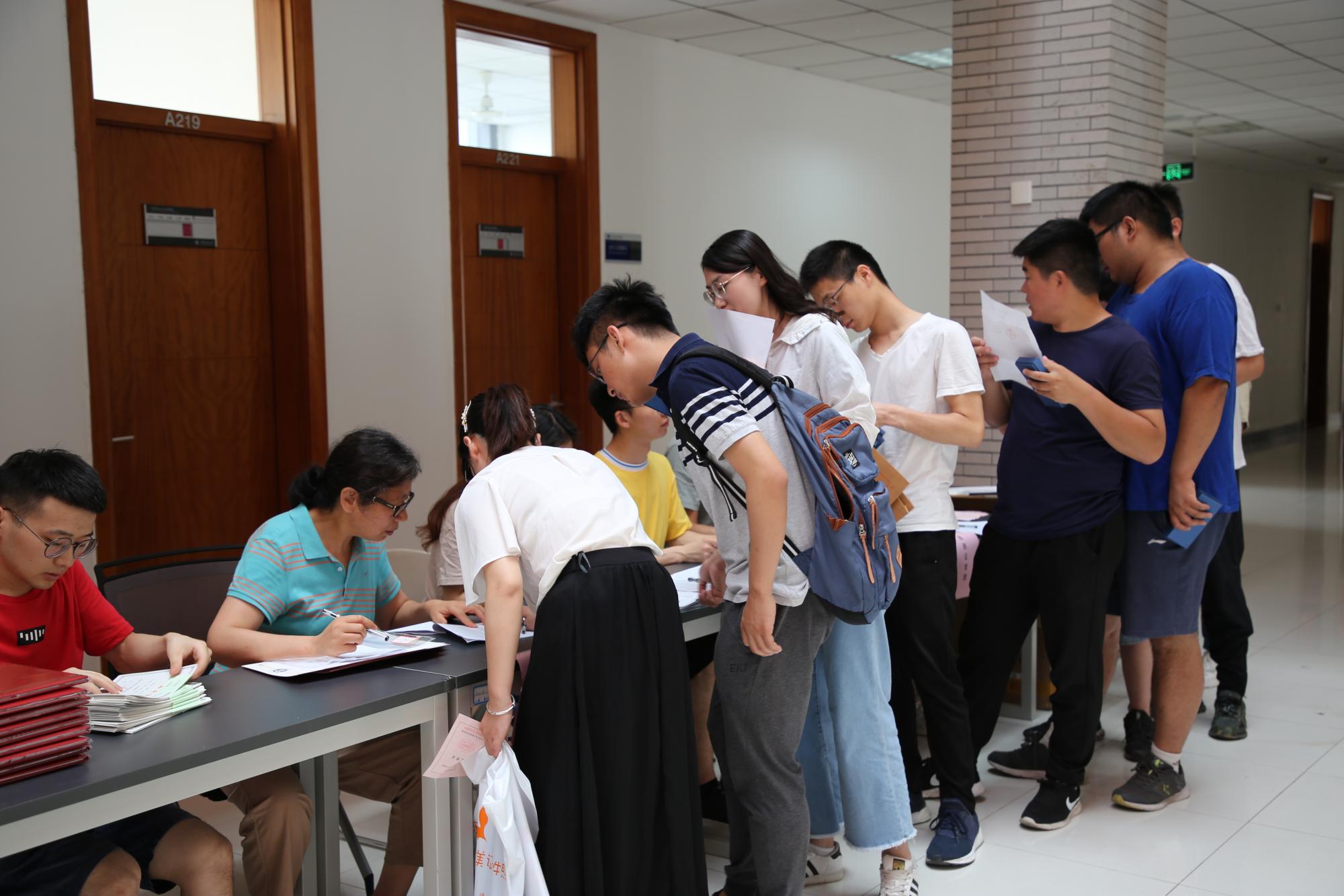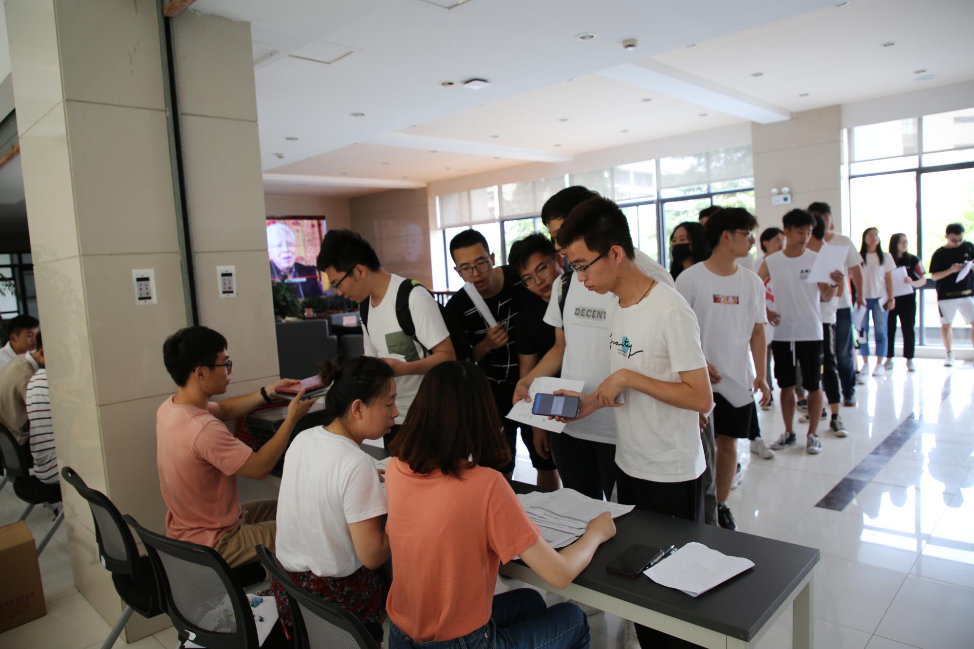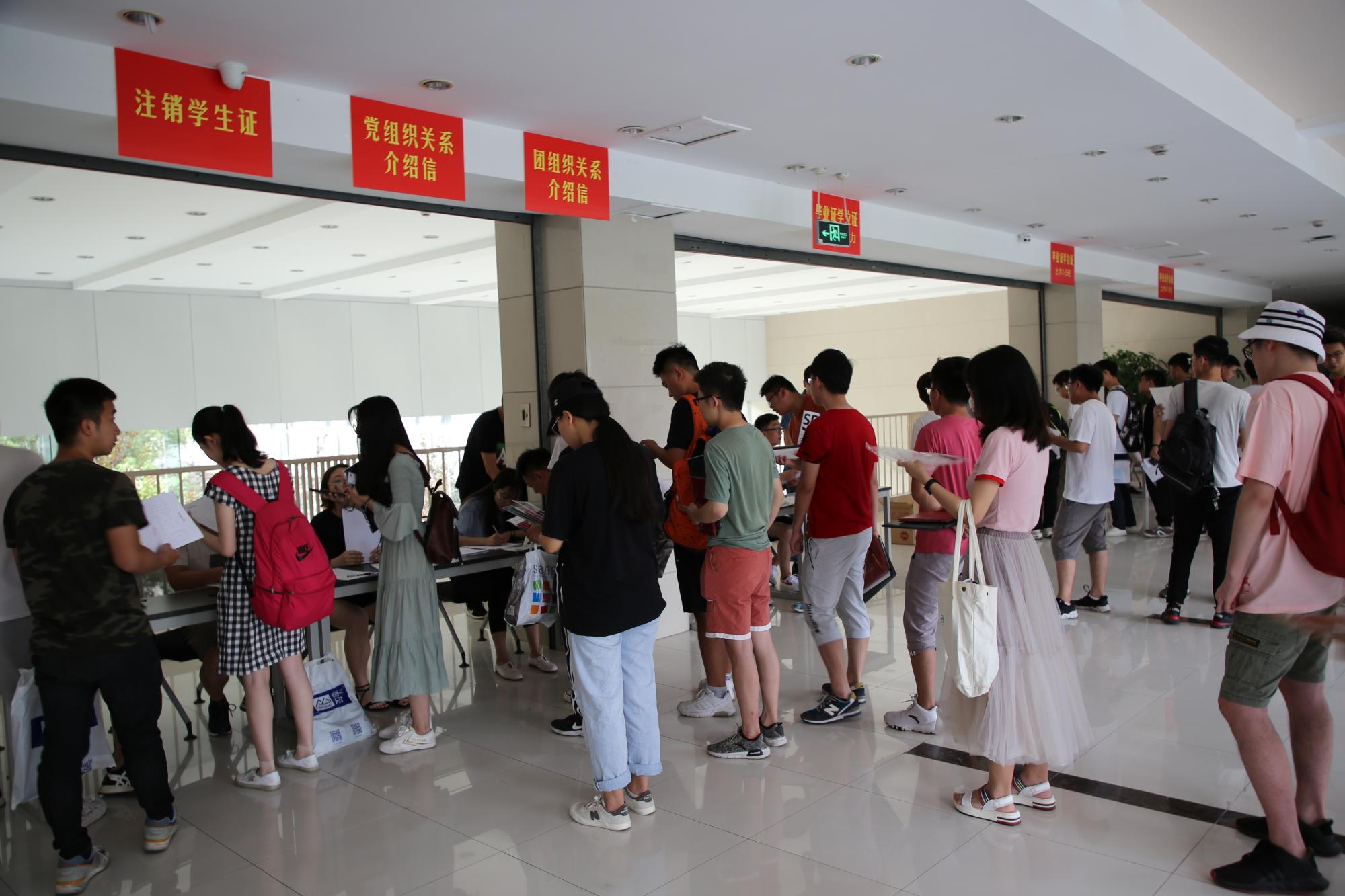 上午八点半,2019届毕业生陆续来到办公地点办理相关事宜。毕业生辅导员骆奕、游洋老师负责统筹工作,同学们排队等候依次进行,现场秩序井然。