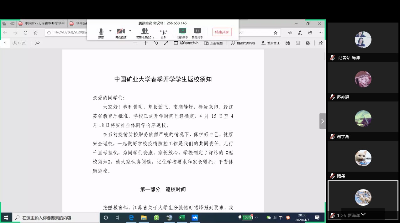 答疑会上,学院2017级辅导员李亮老师从返校时间、返校条件、报道要求、流程以及返校后的疫情防控管理等多个方面进行细致的通知和讲解。讲到返校期间同学们乘坐的交通工具时,李亮老师希望大家能够尽量乘坐直达交通,以求最大限度减少与人群接触,保证自身健康与安全。李亮老师还着重强调了健康报告的重要性,要求同学们以严肃的态度对待四“实”健康汇报。最后,李亮老师对于同学们反馈的问题进行一一解答,包括返校途中个人安全以及抵徐时间在晚上等问题。