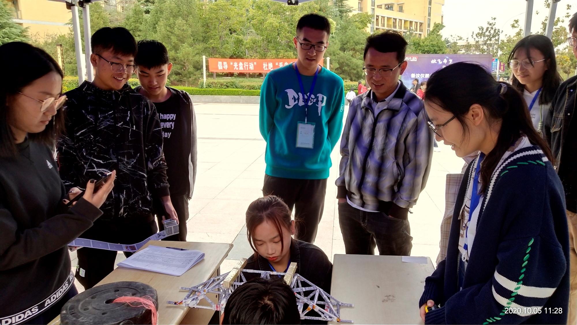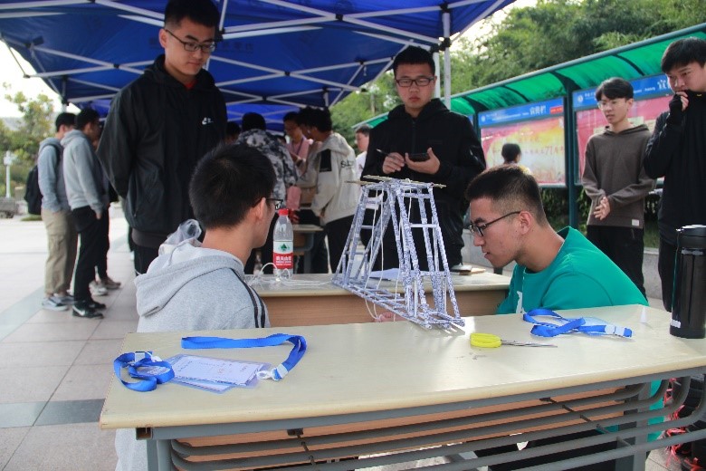 10月5日早上活动正式开始。各个参赛小组首先在工作人员的指引下进行模型称重。紧接着,各个小组负责人在模型指定位置进行承重加载,并由工作人员计时。为了提高模型的稳定性,各小组灵活地将扑克牌进行裁剪、弯曲等,以充分发挥扑克牌的抗拉性能。