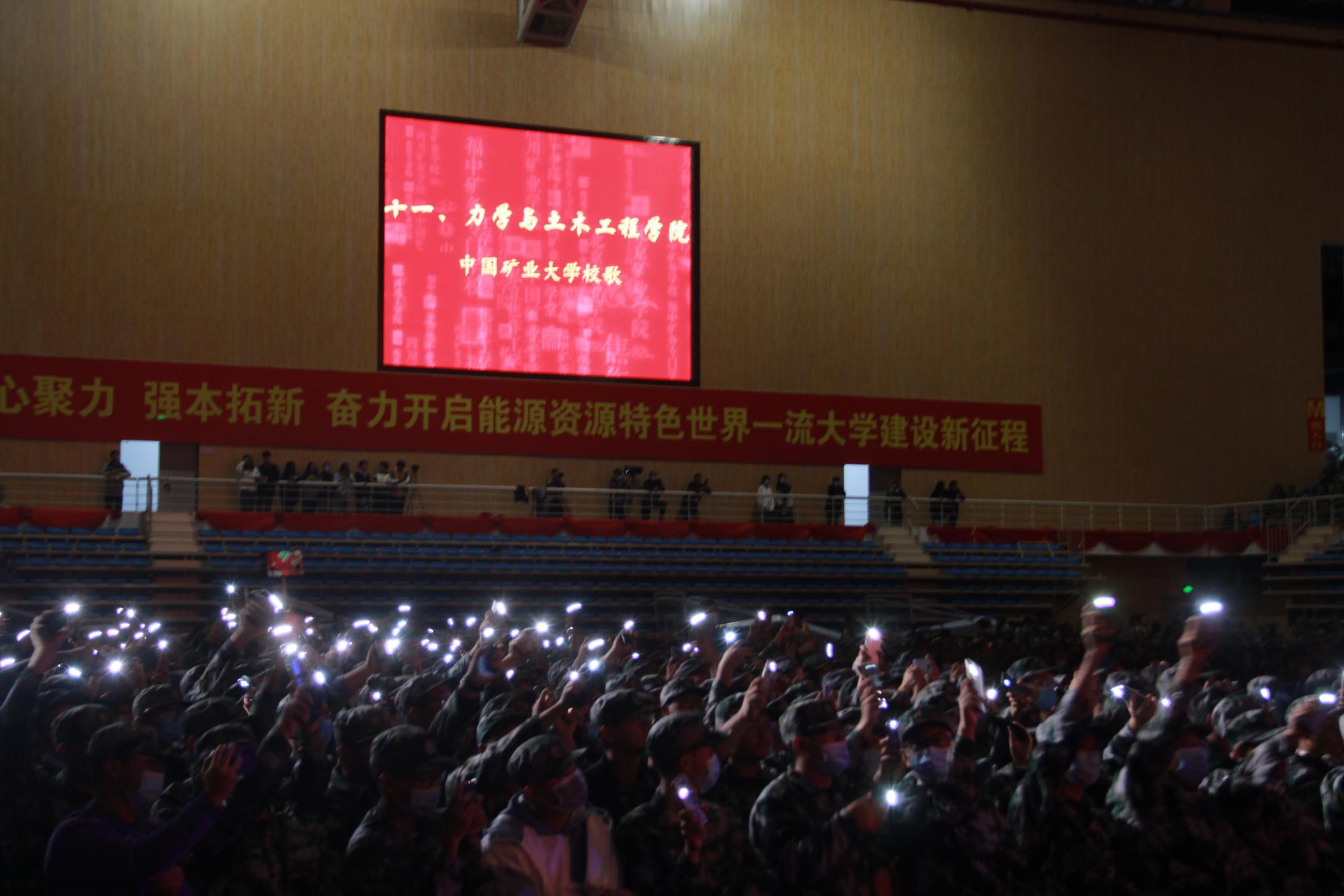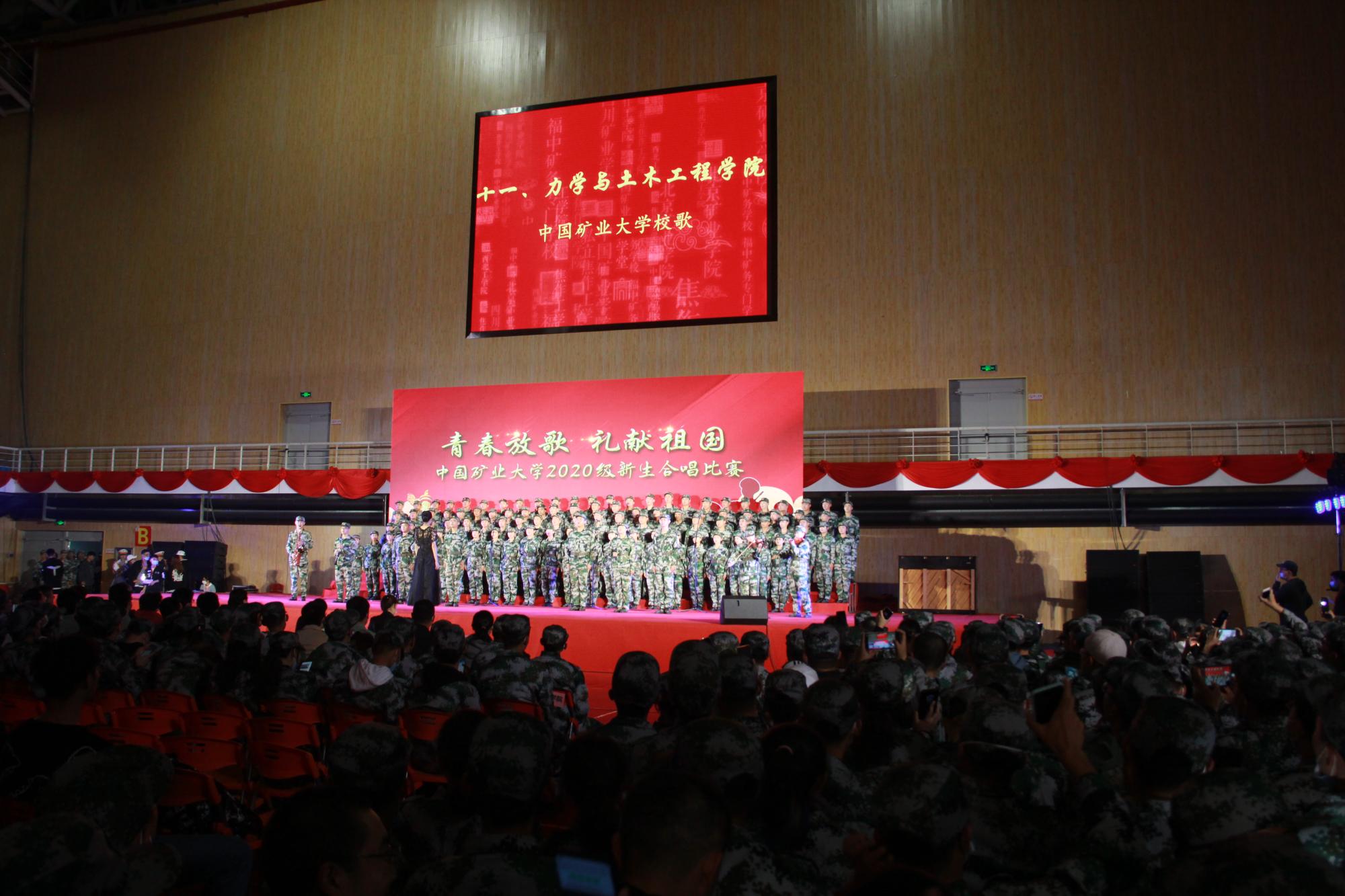 10月14日,我校于南湖体育馆举办2020级新生军训大合唱比赛,19个学院的新生合唱团唱响了青春的乐章,为秋天的矿大带来一抹亮丽的“主旋绿”。学院学子积极参加,在比赛中展现自己的青春风采,流露出强烈的爱国情怀。