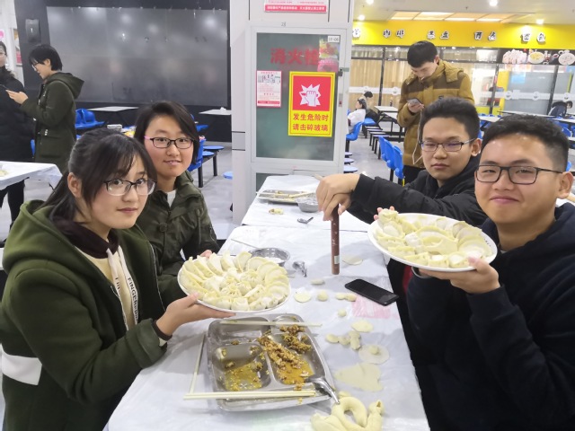 早上8点,天上还冒着细细的冬雨,各参赛队伍仍旧来到了一食堂参加活动。各队伍在领到材料后,揉擀捏包,冬至的第一份饺子就这样在同学们的手中被包好了。在此之前,许多同学从未包过饺子,所以此次活动是他们的第一次试手,但是同学们在活动中还是各尽其职,为包饺子尽了一份自己的力量。值得关注的是,由于地方文化差异和同学们的手艺差别,即便是同一组包的饺子仍然是各有风格。不同组的同学们还相互学习,包出了一个个令人赞叹的饺子。现场一位正在包饺子的同学笑着说:“我觉得这个活动很有意义,可以增进同学、朋友之间的友谊。我是北方人,今天又正好是冬至,老爸老妈肯定也在家里包饺子呢!”本次活动持续时了1个半小时,一食堂参与人员超过60人。