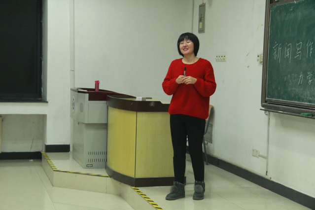 在培训会上,李秀老师从十个方面讲解了新闻写作技能。从标题到内容、从技巧到格式规范,李秀老师结合生动的例子,进行详细的讲解。其中重点讲解了新闻要做到开门见山、要遵循新闻写作的“倒金字塔”原则,首先把最有价值、最具特色的内容呈现给读者。此外还讲解了根据发表平台来定位稿件的技巧、带着问题采写新闻、新闻写作一定要交代齐全五个要素、准确拟定标题、注意不同类型新闻的标题区别等写作技能。同时在语言方面,新闻内容力求通俗客观,李秀老师以“记者的舌头是缩在后面的,新闻是他说的艺术”说出了新闻写作的客观要求。在讲解理论方面的知识后,又剖析了多个具体的新闻写作案例,具体地指出在进行新闻写作时的注意点。讲解结束后,教室里响起了同学们的阵阵掌声。