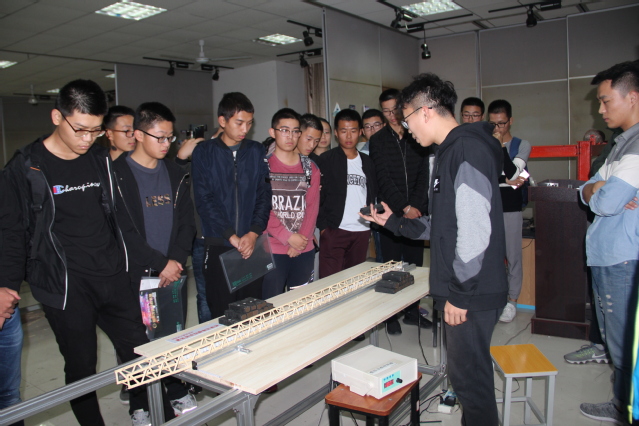 下午5时,同学们来到学院楼进行学习参观。首先展示的是大跨度网壳模型,该模型结构的所有杆件、节点、连接部件均采用比赛所给定竹材及胶水制作完成。制作该模型要求同学们针对静载、随机选位荷载及移动荷载等多种荷载工况下的空间结构进行受力分析、模型制作及试验。过程中创协的成员们还现场展示了该模型的受压能力并向感兴趣的同学传授了模型制作的经验和心得。