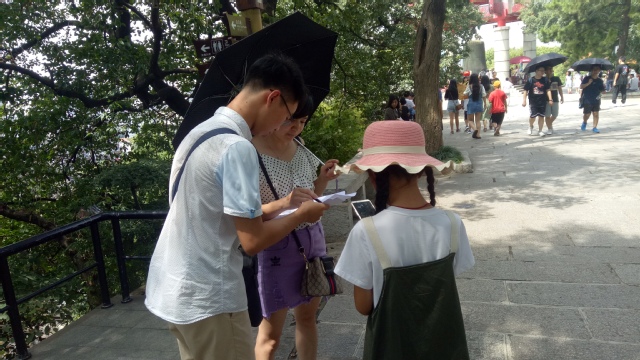 调研开始之前,分队对黄鹤楼的状况进行了资料收集,了解到黄鹤楼所经历的无情的历史洗刷,更理解了其所留存的建筑与文化价值之珍贵。在进入黄鹤楼景区之前,分队成员向园区内的各年龄段的游客及当地居民进行问卷调查,详细调查他们对古建筑保护的了解程度,从而引导被调查人员思考该方面的问题并记录他们的感想。调研同时,分队成员还鼓励他们行动起来,从个人行为开始,为保护古建筑奉献出自己的一份力量。分队进入景区后,向负责人了解在保护古建筑方面的相关措施与未来的发展方向,并向负责人提出黄鹤楼保护的建议,作为本次活动的思考与收获。