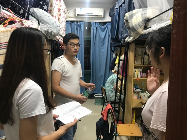 学期伊始,随着学生陆续返校,为落实学校安全管理制度,同时也为营造学生宿舍良好的学习、生活氛围,9月2日下午及晚上,学院2016级专职辅导员曹鹏老师与兼职辅导员冯小雨、舒畅、张悦老师前往学生宿舍,对学生开学返校情况与宿舍安全卫生状况进行了检查。