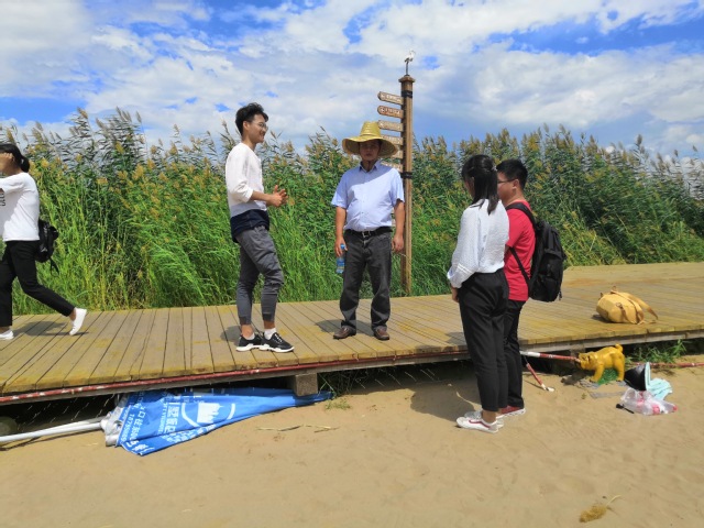 当天下午,实践团抵达沙湖生态环境治理区,先后与两位游客和一位工作人员就风沙治理的问题进行讨论。在交流的过程中,治理人员多次感叹近些年来风沙治理后,环境得到了较好的改善,两位游客也表示环境治理的成果超出他们的预期;同时,治理人员也指出一些环境治理的不足之处,将自身体会分享给调查人员。在交流中,调查员了解到在春秋两季,由于气候,风沙侵袭仍然偶有发生。调查成员记录一系列问题,将其作为第一手资料。