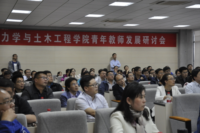下午2点30分,在叶继红院长的主持下,青年教师研讨会正式开始。李杰、肖岩、李晓、肖建庄、苏万成、朱建波、郭彤教授先后上台与众青年教师分享了个人的学术观点和理念,并对青年教师的工作做出指导性的意见和建议。其中,同济大学教授李杰以“读书三结合”为主题,围绕如何做一个好的教师,向青年教师分享了自己的感受,最后以“见于师齐,减师半德。见过于师,方堪传授”作为结语表达了自己对于教书授业的观点。南京工业大学教授肖岩以科研体会作为报告,与青年教师们分享了自己的真实经历和心得。教授们的演讲内容涉及广泛、角度多样,为青年教师们提供了宝贵的教学经验。
