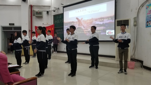 晚上5点,学院的参赛队伍早早地来到博2进行赛前的训练。晚上6点,手语操比赛正式开始。在主持人简短的开场白之后,参赛队伍便轮流上台展示。此次的参赛队伍是以学院为单位进行组队参赛的。在环测和外文学院几支队伍的精彩表现之后,学院的参赛队伍9:57TMXZ88.33上台演出。起先,有一位男生上台在音乐的衬托下起身舞剑,在一阵掌声过后。由10人组成的队伍上台,在背景音乐《追光者》下,上演了一段精彩的手语舞。本次比赛由各学院心理自助中心主任做评委,同时由现场大众评委进行投票,大众评委每人均有两票,本着公平公正的原则,最后土木学院以第七名的好成绩进入决赛。